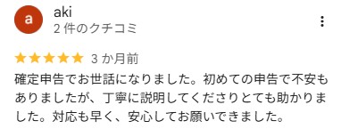 確定申告でお世話になりました。初めての申告で不安もありましたが、丁寧に説明してくださりとても助かりました。対応も早く、安心してお願いできました。